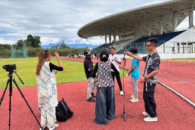 Outdoor training photo at Mimika Sport Complex, Timika (2/13), where participants practiced creating podcasts outside the studio. Each team was assigned different tasks, including monologue, roundtable, panel discussion, expression, interview and storytelling. |