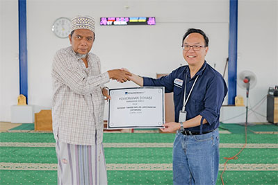 PTFI menyerahkan hasil penggalangan dana dari seluruh karyawan dan kontraktor PTFI dengan total senilai 70 juta rupiah oleh Aripin Buman, Vice President Business Process Smelting & Refining kepada KH. Abdul Muid Zahid, Ketua Yayasan Takmir Masjid Jami Manyar (Yatamam) Kecamantan Manyar, Gresik. |
