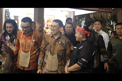 Minister of Culture Fadli Zon visiting the Kamoro Tribe art exhibition booth displaying woven noken art and carvings at the 2024 Papua Land Noken Festival in Jakarta (12/20-22). |
