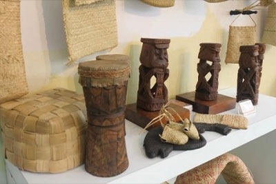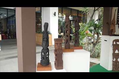 Various Kamoro carvings and woven noken decorating the Sarinah Pavilion, location of the 2024 Papua Land Noken Festival. |