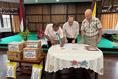 PTFI Executive Vice President (EVP) for Technical Services Chris Zimmer symbolically presented the company’s assistance of nutritious food packs for artisans to Agats Bishop Mgr. Aloysius Murwito at the Agats Diocese Offices on Tuesday (8/10/2024).