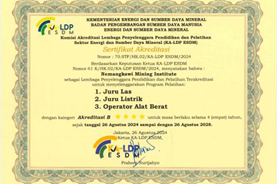 PT Freeport Indonesia’s Institut Pertambangan Nemangkawi/ Nemangkawi Mining Institute (IPN/ NMI) was awarded B Accreditation certification as an Education and Training Institution for Welders, Electricians, and Heavy Equipment Operators, from the Accreditation Commission for Education and Training Institutions in the Energy and Mineral Resources Sector (KA-LDP ESDM).. |