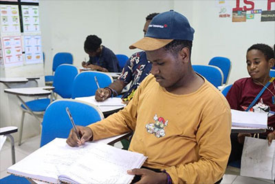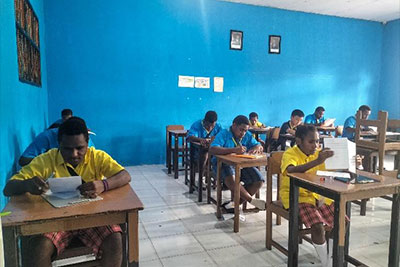 Eka Balinol (front-right), a 5th grade SATP elementary student, and Yulian Diwitau (front-left), a 4th grade SATP elementary student, undergoing regional selection for the Asia International Mathematical Olympiad (AIMO) held at Sekolah Integral Hidayatullah-Timika, Mimika Regency, last May. |