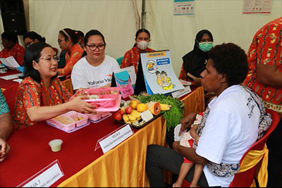 Tim Dinas Kesehatan Kabupaten Mimika menjelaskan penganekaragaman pangan kepada ibu peserta Program Kesehatan Masyarakat Terintegrasi Melalui Pengendalian Malaria dan Pencegahan Stunting. |